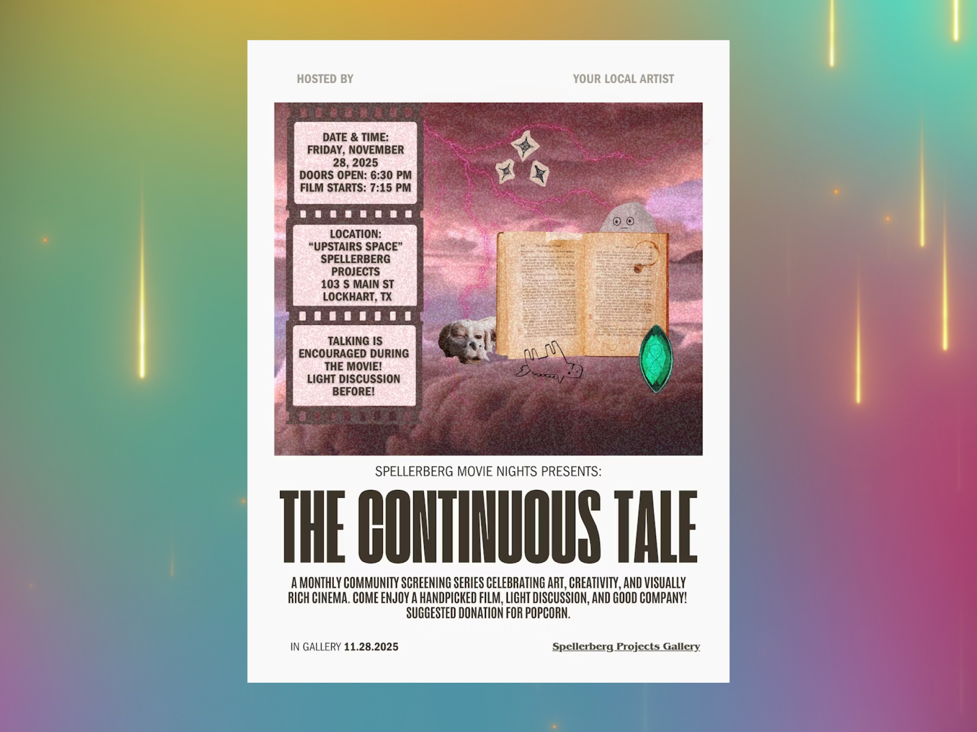 Join us on November 28th at 6:30 PM for a cozy community screening of the classic “The Continuous Tale” 😉. We’ll kick things off with a few fun art-focused questions, then settle in for a night of nostalgia.